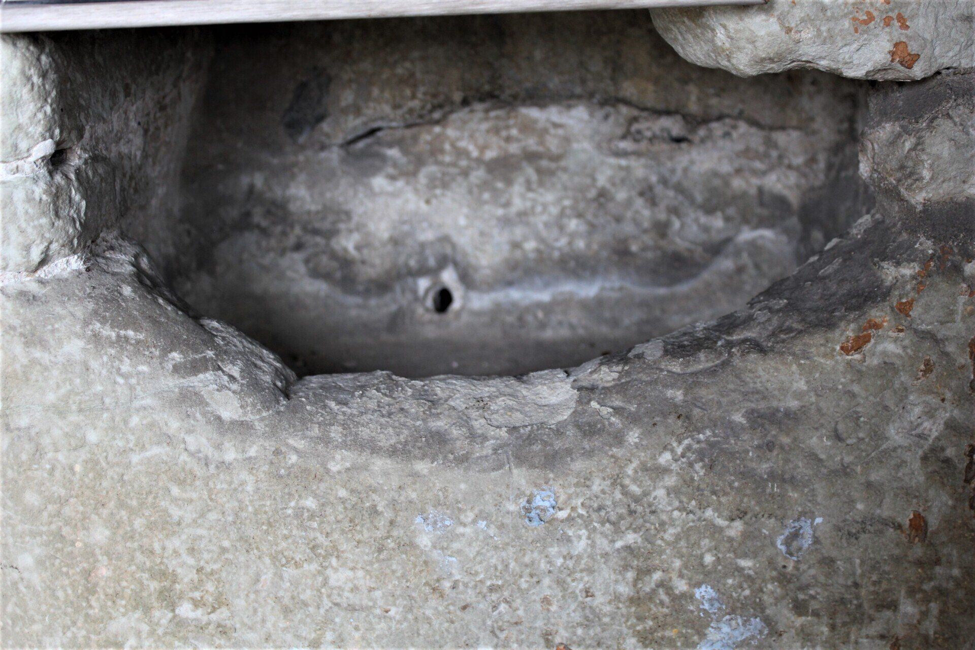 A Stoop is a basin for holding Holy water for the use of those entering the Church. It is derived from the fountain in the old basilicas in which the faithful washed their hands and face. Usually of stone and built into a niche. This Stoop is very unusual as it is a double stoop being fed from one inside the church.