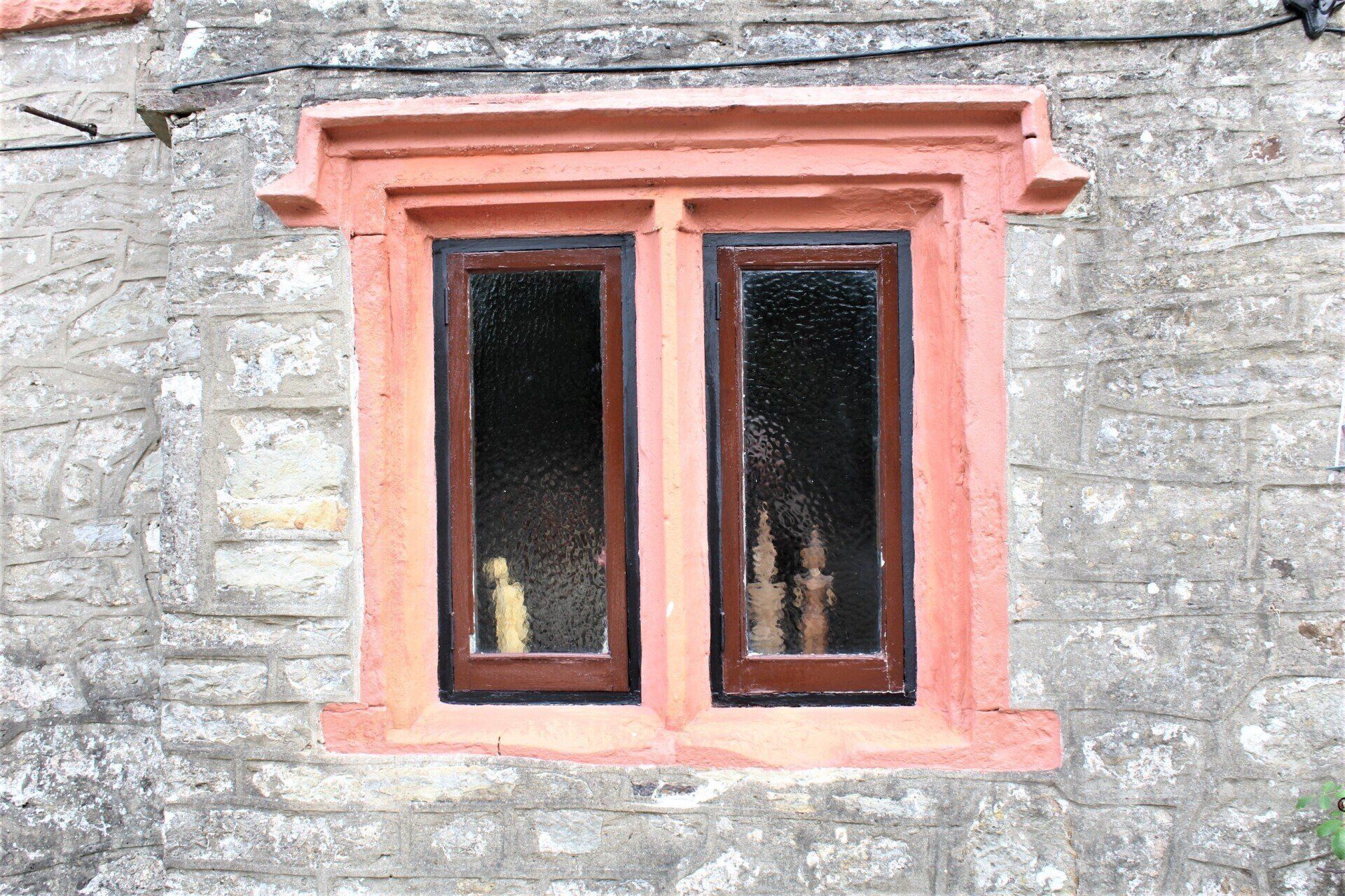 Built of stone rubble with painted ashlar dressings, a Welsh slate roof with ridge stack right and an end stack left. The main frontage comprises a two storey three window range of square headed casement windows with sills, shallow stone voussoirs to first floor and lintels to ground floor, and a centre left shallow cross bay. The gable end with ball finial breaks forward and has 2-light windows in moulded surrounds with hollow chamfered mullions and square hoodmoulds, two to ground floor and one above; small lights in returns. Between two ground floor windows right is gabled porch of dressed stone with replaced wooden door with older metal fittings. The gable end to the right has a window with heavy square hood mould under a relieving arch and blocked arched opening to ground floor.