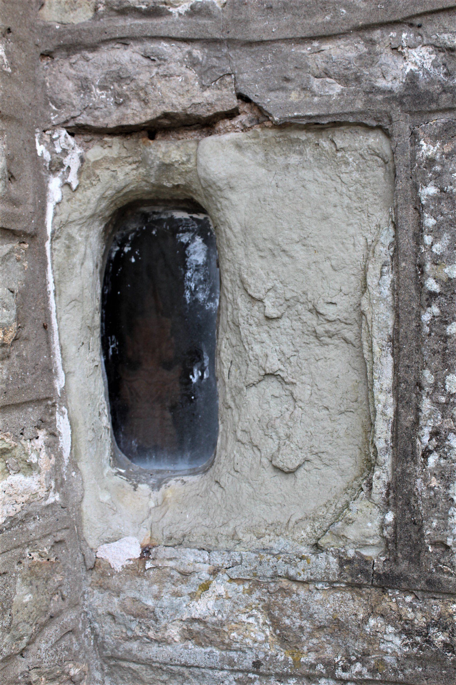 A pointed arched doorway to the left leads to the North West wing with a thick early wall left; a blocked central doorway between two windows. A square headed doorway to the East cross wing which has a wide open fireplace with arched timber bressummer, a former oven left and niche right; and a curved flight of stone steps to right.